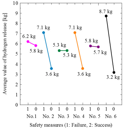 Figure 12 shows the average values of the hydrogen released at each level for each safety measure. A safety measure having a large difference between the average values, i.e., a large inclination in the graph in Figure 12, indicates that the influence degree of the safety-measure failure is high. As shown in Figure 12, the influence degrees of the failures of the safety measures, No. 2, 4, and 6, are larger than those of the safety measures, No. 1, 3, and 5. Although the failure of the safety measure, No. 6, is the highest among those of the safety measures, No. 2, 4, and 6, the capacities and initial pressures are the same for the three accumulators in this model. Thus, it is unlikely that the influence of the failure of only the safety measure, No. 6, is high. This is because of the existence of non-significant factors in the six safety measures. If the non-significant factors are included, it may lead to erroneous results. When the safety measures, No. 2, 4, and 6, are not opened, the safety measures, No. 1, 3, and 5, cannot affect the amount of hydrogen released. In this verification, it is not possible to consider the interaction between the factors. Moreover, whether the level is statistically significant can be judged using the p-value, which is a correlation coefficient. In general, when the p-value of a factor is high, the factor is considered non-correlated and non-significant. Table 8 lists the results of the multiple regression analysis. The p-values of the safety measures, No. 1, 3, and 5, are higher than those of the safety measures, No. 2, 4, and 6. Thus, we conducted an additional analysis neglecting the non-significant safety measures (safety measures, No. 1, 3, and 5) as listed in Table 9. To make the difference clearer, the diameter of the leakage hole was changed from 1 mm to 5 mm. The initial value of the pressure is 82 MPa. Table 9 lists the analysis results. Figure 13 shows the average values of the amount of hydrogen released for safety measures, No. 2, 4, and 6. As shown in Figure 13, the influence of the safety measure, No. 6, is slightly lesser compared to that of other safety measures. This is because of the difference in the pressure loss due to the length of the pipes between the safety measures and the leakage point. That is, it was found that the influence degree of the accident was slightly larger when the safety measures closer to the leakage point failed. The significance of the safety measures is evaluated by excluding the non-significant factors. By taking this evaluation procedure, it is possible to evaluate the significance of safety measures when they are arranged in parallel with respect to the accidents. Although it is shown that this evaluation method is effective for the simple case in this study, it is expected to demonstrate further effectiveness in cases where the evaluation target is complicated.