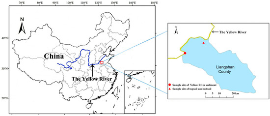 The topsoil, subsoil, and Yellow River sediment used in the study were collected from Liangshan County (Figure 1). The Yellow River sediment was collected from the Chenhai Yellow River diversion gate in Liangshan County. The topsoil and subsoil were collected from normal farmland. Before sampling, the surface litter was removed. Topsoil samples were obtained at a depth of 0 to 30 cm in a farmland soil profile. The subsoil samples were taken below 30 cm of the soil profile.