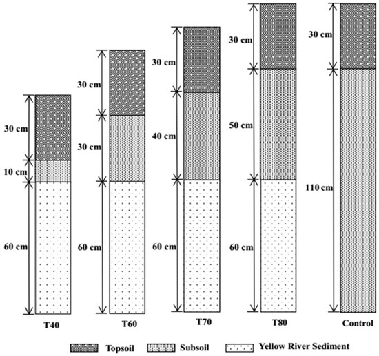 A column experiment with different soil covers on Yellow River sediments was designed for selecting the optimum thickness of soil cover in a greenhouse. There were four experimental treatments with different soil covers and one control treatment in this experiment (Figure 2). Each treatment was repeated three times. The control treatment was an original soil profile with 30 cm topsoil plus 110 cm subsoil. The four experimental treatments had the same thicknesses of topsoil (30 cm) and Yellow River sediments (60 cm), and different thicknesses of subsoil, which were 10, 30, 40, and 50 cm, respectively. Thus, the total thicknesses of soil cover (topsoil plus subsoil) were 40 cm, 60 cm, 70 cm, and 80 cm, respectively. The total thickness of soil cover over Yellow River sediment was the primary variable in this study. Therefore, we use the total thickness of soil cover as the name of experimental treatments.