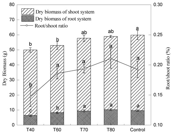 The dry biomass of both the shoot system and the root system roughly increased with increasing thickness of soil spread over sediment (Figure 3). The highest dry biomass of the shoot system was obtained in the control, while T80 had the maximum dry biomass of the root system. T40 and T60 had significantly lower dry biomasses of the shoot and root system than the control; furthermore, the dry biomasses in T70 and T80 were not significantly different from those in the control, and the root-shoot ratio in T60 was not significantly different from that in the control.