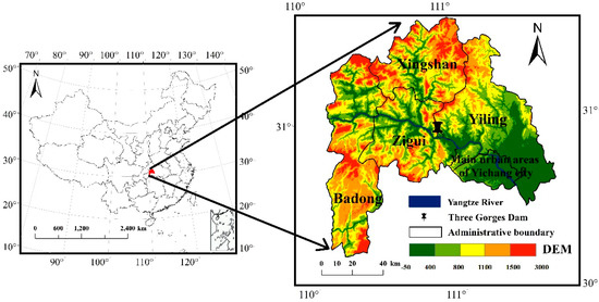 Hubei section of Three Gorges Reservoir Area (TGRA) is located in the middle reaches of the Yangtze River, which lies at the head of the TGRA. The Hubei section of TGRA covers five parts (Yiling districts, main urban areas of Yichang city, Zigui county, Xingshan county and Badong county), extending from 110.06° to 111.65° E longitude and 31.06° to 31.56° N latitude (Figure 1). The total area of this land is approximately 11,895 km2, with a population of 1.48 million people. Mountains and hills are the dominant terrain, with a summit that reaches 1000 to 2000 m. In addition to Yangtze River, some headwater rivers and streams are located in northern parts of Badong county, southern parts of Xingshan county and southeastern part of Yiling districts. This region has a typical subtropical monsoon climate with an annual average precipitation from 1000 to 1400 mm. Sub-tropical evergreen broad-leaved forest and warm coniferous forest are the main vegetation types. The soil type mainly includes yellow brown soil, rock soil, yellow soil, and purple soil.