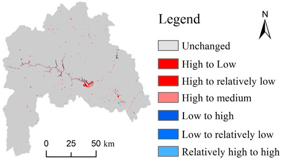 Based on habitat quality maps of 1990 and 2010, spatial changes of habitat quality were obtained in the past two decades (Figure 9). The landscape transition showed a decreasing trend of habitat quality grade from high to low and relatively low grade in areas of study region. The changes of habitat quality grade from high to low grade were that large areas of woodland and grassland have been developed for residential land, industrial and traffic land. The changes of habitat quality grade from high to relatively low grade were the transitions from woodland and grassland to canals. The construction of the Three Gorges Dam, impoundment in the TGR area and environmental migration contributed the increasing area of construction land and waters, decreasing area of woodland and grassland, and a decline of habitat quality as a whole.