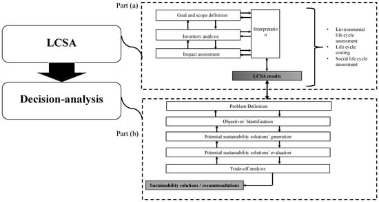 Moving from sustainability assessment results of LCSA toward practical actions of improving the sustainability performance of product systems goes beyond the interpretation phase of LCSA. This needs a decision-analysis approach that works with LCSA [23] in a systematic and structured way to appraise the pool of potential solutions and evaluate their trade-offs in order to propose potential sustainability solutions. Thus, there is a need for an explicit systematic structured framework that iteratively integrates an LCSA step with a decision analysis step.