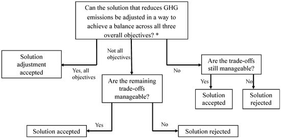Based on the evaluation conducted in the previous section, we can find creative ways to adjust some of the proposed solutions to find a balance between the overall environmental, economic and social objectives and manage some of the existent trade-offs. The process of the trade-off analysis in Figure 3 was followed in reviewing the life cycle stage-focused strategies. The process subjects all the proposed solutions that reduce GHG emissions to a three-step what-if acceptability tests and related manageability tests: