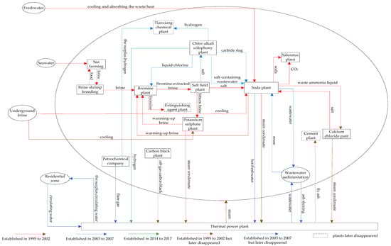 HHIS is located in the Weifang Binhai Economic and Technological Development Zone (WBETDZ) in Shandong Province, China. The main participants of HHIS are attached to HHG. HHIS was developed based on the salt–soda operations of the Yangkou salt field and Weifang soda plant in 1995. Other symbiotic companies were introduced later []. Evolving over 20 years, HHIS gradually formed a characteristic marine chemical industrial symbiosis, which focuses on underground brine and seawater utilization. At present, the key participating companies are a salt field, a soda plant, a thermal power plant, a bromine plant, a saleratus plant, a potassium sulfate plant, a calcium chloride plant, a petrochemical company, and a chlor-alkali colophony plant. The major products are salt, soda, bromine, potassium sulfate, calcium chloride, bromide, and chlor-alkali. In 2005, WBETDZ, in which HHIS is located, was designated as a National Eco-industrial Demonstration Park by the State Environmental Protection Administration (SEPA, now the Ministry of Ecology and Environment, MEE), and is currently the only national-level marine chemical eco-industrial park in China. In the same year, HHG, the parent company of HHIS, was identified as one of the National Circular Economy Pilot Enterprises by the National Development and Reform Commission (NDRC). The symbiotic relationships in HHIS are shown in Figure 1 and Table 3.