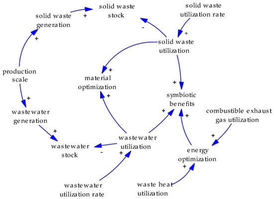 The interaction between two variables can be described by causal chains indicated by arrows from “cause” to “effect”. The polarity of cause chains (positive or negative) indicates how the dependent variable will change as the independent variable changes []. The positive polarity (“+”) indicates a positive correlation. While similarly, the negative polarity (“−”) indicates a negative correlation []. As shown in Figure 1, based on the actual situation of HHIS, if the production scale in HHIS expands, the generation of solid waste and wastewater will both increase. Then, the wastewater stock and solid waste stock will increase as well. If the utilization rate of wastewater and solid waste achieved by establishing symbiotic relationships increases, the quantity of the utilization of wastewater and solid wastes will increase, and the stock of wastewater and solid waste will decrease. Then, the optimization of materials will be improved, and the symbiotic benefits will also increase. There are types of combustible exhaust gas in HHIS, such as off-gas carbon black, flare gas, and hydrogen. If the utilization of combustible exhaust gas and the waste heat increase, the optimization of energy will be improved, and the economic benefits will increase as well.