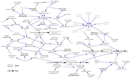 The causal loop diagram can describe the basic relationships between variables related to the energy and materials in HHIS. A stock–flow diagram is a more detailed and in-depth description of a system structure, which can not only clearly reflect the logical relationships among variables, it also can further divide the variables into different sorts, including “level variable”, “rate variable”, “auxiliary variable”, and “constant” [,]. Based on the causal loop diagram and the characteristics of HHIS, a stock–flow diagram was established, which is shown in Figure 3. Flow is composed of inflow and outflow, which are rate variables. For example, the output of waste ammonia liquid is the inflow, and the utilization of waste ammonia liquid is the outflow. The inflow minus outflow is the increment. The stock is the accumulation of the increment within a certain time (one year was chosen in this paper). The level variable refers to the change over time in the accumulation of the increment, such as the stock of solid waste and wastewater. The rate variable reflects the rate of inflow and outflow, and directly changes the accumulation of the increment, such as the annual solid waste increment and annual wastewater increment. The auxiliary variable is an exogenous or intermediate variable [], such as the quantity of recycling of wastewater and bittern brine utilization. The constant refers to variables that can be considered to be constant over time, because of changing very slowly []. Shadow variables are printed between ‘< >’, which assists in drawing the stock–flow diagram. With these variables, a stock–flow model can be achieved using the Vensim software.