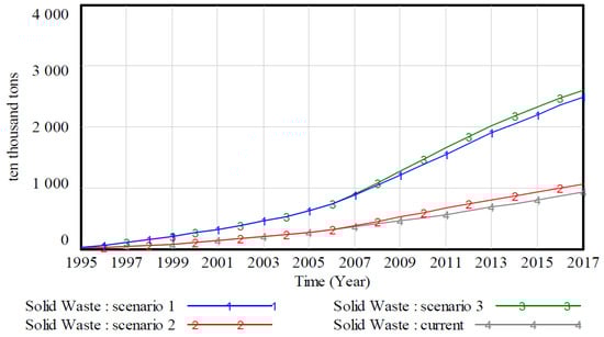 The scenario analysis of solid waste is shown in Table 6. Based on the simulation of four scenarios, the results of solid waste stock during the evolutionary process of HHIS is shown in Figure 5.