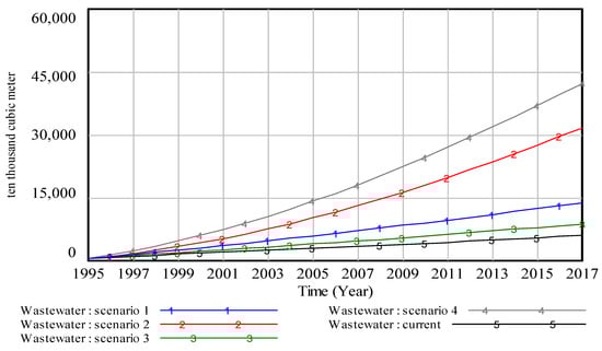 The scenario analysis of wastewater is shown in Table 8. From the simulation of the five scenarios, the results of wastewater stock within HHIS is shown in Figure 6.