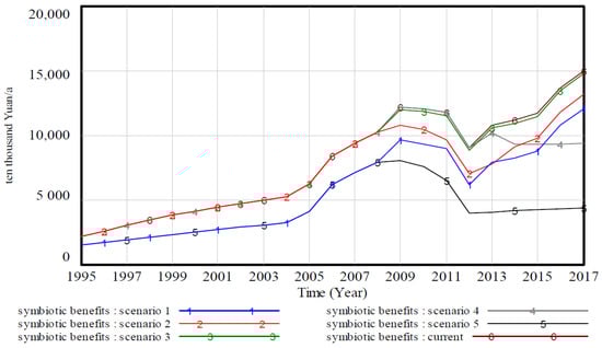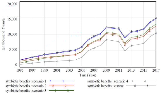 In Figure 7, from 1995 to 2008, curve 1 and curve 5 are below curve 6. The reason is that in terms of energy utilization, symbiotic benefits were only achieved by waste heat utilization from 1995 to 2008. Other symbiotic relationships on energy utilization were not established; thus, there were no symbiotic benefits generated. After 2008, there is a gap between curves 1 to 3 and curve 6, which indicates that the symbiotic relationships regarding the utilization of waste heat, off-gas carbon black, and flare gas all brought good symbiotic benefits. The symbiotic relationship regarding hydrogen utilization that was established in 2012 achieved significant economic benefits, which made the system re-emerge in the growth trend after the decrease from 2011 to 2012, which was caused by the disconnection of the symbiotic relationship regarding carbide slag utilization.