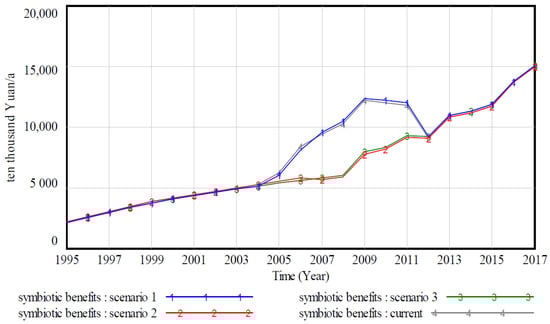 Through the scenario analysis of energy consumption, solid waste, and wastewater, the changes of symbiotic benefits in the evolution process of HHIS can be seen in Figure 7, Figure 8 and Figure 9.