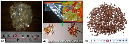 - Mathew, P.; Varghese, S.; Paul, T.; Varghese, E. Recycled plastics as coarse aggregate for structural concrete. Int. J. Innov. Res. Sci. Eng. Technol. 2013, 2, 687–690. [Google Scholar]