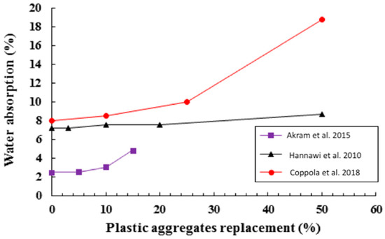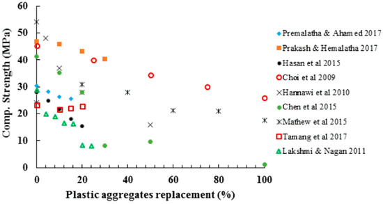 - A gradual decrease in the compressive strength development occurs with an increase in the content of plastic aggregate (both fine and coarse). Some studies, however, showed an increase in compressive strength for low levels of recycled waste plastic.