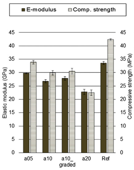 - Hobbs, D. The dependence of the bulk modulus, Young’s modulus, creep, shrinkage and thermal expansion of concrete upon aggregate volume concentration. Mater. Struct. 1971, 4, 107–114. [Google Scholar] [CrossRef]