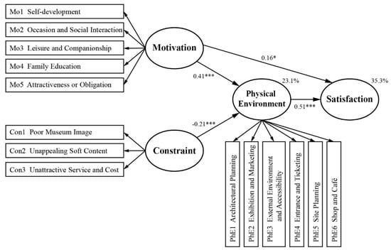 Interpretation of the structural model. Museum physical environment acts as an axial function in the model to transfer the impacts of motivation and constraint to visitor satisfaction. The indirect effect of motivation on satisfaction through physical environment is greater than its direct effect on satisfaction. Constraint has no direct effect on satisfaction.