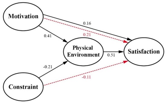 Direct and indirect effects among motivation, constraint, physical environment and satisfaction.