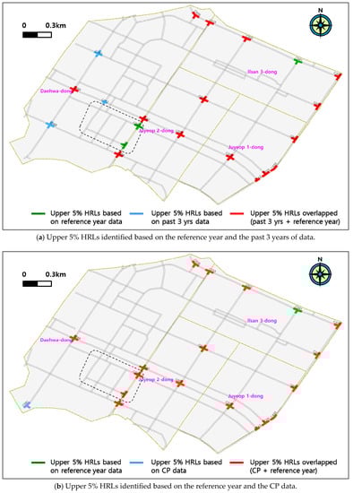 - Identification of real HRLs using the EB method: Since the potential HRLs from the two datasets were identified using datasets prior to 1 July 2013, the real HRLs were identified based on crashes that occurred during a half-year period from 1 July 2013 to 31 December 2013, using the EB method.