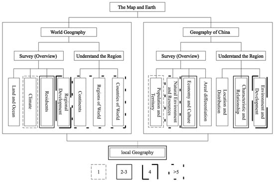 Standards and textbooks are the primary source for the learning of subject knowledge and understanding which pupils need to develop during their schooling [32]. The authors primarily analyzed the Geography Curriculum Standards for Compulsory Education, published by the Chinese Ministry of Education in 2011. Geography Textbooks for, Grade 7 and Grade 8, which were published by People’s Education Press in 2012, were also analyzed.