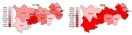 We take the representative years of 2006, 2010, 2015 and the average value of the Yangtze River Economic Belt 2006–2015 comprehensive technical efficiency of sustainable development for spatial and temporal evolution analysis. The comprehensive technical efficiency of provinces and municipalities is sorted according to the calculation results. ArcGIS 10.2 was used to draw the spatio-temporal evolution map of YERB comprehensive technical efficiency in sustainable development from 2006–2015. The deeper red shading in the map represents higher comprehensive technical efficiency of a given province or city (Figure 1).