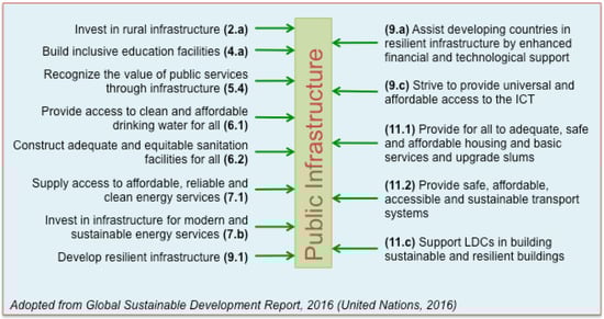 - Sustainable infrastructure investments were addressed in the 2030 Agenda for sustainable development under sustainable development goal (SDG) #9 by building resilient infrastructure, promoting sustainable industrialization and fostering innovation, as well as under each of the other goals such as alleviating poverty, eradicating hunger, supplying energy access for all, providing quality health care and education for all, promoting social equity, and propelling fair economy [].