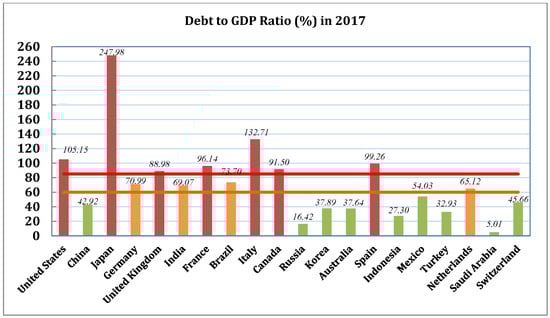 After dividing these countries with the highest GDP into the public-debt sustainability zones (henceforth called as debt sustainability zones and sustainable debt zones) according to the second criterion, the United States, China, Japan, and Germany were selected to analyze their external and domestic public debt effects on financing public infrastructure depending on their gross government debt-to-GDP ratio (see Figure 3). China (43%), Germany (71%), and the United States (105%) fall respectively into the sustainable, quasi-sustainable, and unsustainable debt zones according to their debt-to-GDP ratios. Furthermore, Japan (248%) is also included in the study due to the fact that it falls definitely into the unsustainable debt zone because of its excessive gross government debt. These are the four pioneer countries in sustainable energy for building more than half of the global renewable power capacity [] and good representatives for the global economy because they constitute approximately half of the world’s GDP (see Appendix A.2).