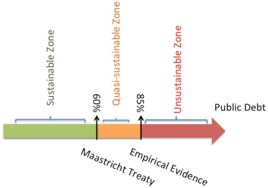 - These countries were divided into three groups according to their debt-to-GDP ratios. We assumed that there were two sustainability thresholds for sovereign debt-to-GDP ratio as reported in the literature. First, the Treaty on the European Union (i.e., Maastricht Treaty) states in the second criteria of article 121 that, as a reference point, the ratio of gross government debt must not exceed 60% of their GDP at the end of each fiscal year []. Second, Cecchetti, Mohanty, and Zampolli [] reported according to their empirical results that gross government debt should not exceed 85% of the GDP for sustainable economic growth. In this regard, this study assumes that countries fall into three debt zones, which are (a) sustainable (lower than 60% debt/GDP ratio); (b) quasi-sustainable (between 60–85% debt/GDP); and (c) unsustainable (higher than 85% debt/GDP) (see Figure 3).
