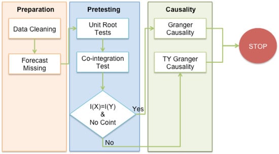 Causality: In the green-colored column, Granger [] or Toda-Yamamoto Granger causality [] is applied on the datasets by considering the results in pretesting. If the integration numbers of related datasets are the same with each other and there is no co-integration between them, then conventional Granger causality can be performed, otherwise Toda-Yamamoto Granger causality has to be conducted.