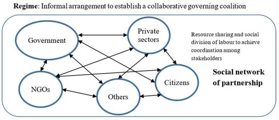 Contemporary policy-making processes are usually situated in a complex and ever-changing environment, which covers multiple sectors or boundary-spanning spheres. Unlike ‘government’, ‘governance’ can be termed as a flexible policy-making process based on individual networks, especially strong associations between governments and non-governmental actors []. Accordingly, network governance integrates non-formal social networks of non-state actors in addition to formal government systems of actors [].