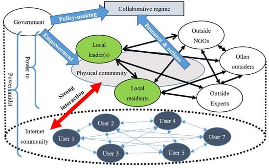 From an RT viewpoint, community power arises from the process of social production among multiple stakeholders involved in the informal arrangement rather than from social control under the legislative framework of the government. In other words, the governing capacity of a community regime emanates from the synergy of power-to—the government empowers other non-governmental actors in a governing coalition—but not power-over—the government controls people through a hierarchical system (Stoker 1995). The concept of social production implies that governing coalitions can evolve with the enduring socio-economic transformation [,]. In addition, a new networking interaction exists between the virtual place based on SNSs and the physical place that requires face-to-face interaction. The new community network and collaborative coalition jointly constructed by both may reshape a type of community regime.