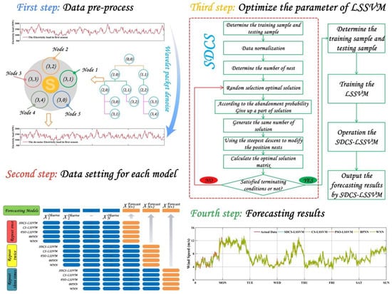 After the wavelet packet transform, the filtered wind speed time series is input to the optimized least squares support vector machine. The overall flowchart of the proposed hybrid forecasting model is shown in Figure 1 (third step).