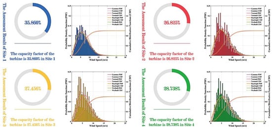 The probability distribution of wind speed can be used to measure the distribution of wind energy resources in a place. The common probability distributions are normal, Reyleigh, gamma, and Weibull, which use the distribution function to fit the probability distribution of wind speed. In this paper, four kinds of probability distribution are used to assess wind speed density. Figure 2 and the Appendix A (Table A1) show that the Weibull distribution well fits the distribution of wind speed. For example, the R-square of four probability distributions at Site 1 are 0.918, 0.768, 0.831, and 0.765. In the assessment of Site 2 processing, the Weibull distribution also well fits the wind speed distribution, which the sum square error (SSE) of Weibull distribution is 0.876 lower than the other distributions. The doughnut in Figure 2 shows the capacity factor of each site, with values of 35.860%, 27.456%, 26.825%, and 28.738%. In order to accurately assess wind speed, four different optimization algorithms are used to optimize the parameters of the Weibull distribution. From Appendix A (Table A1) we can clearly see that the optimal Weibull distributions are obtained by different optimizations; the optimal Weibull distribution for Site 1 is CS-Weibull and the other optimal Weibull distributions are shown in the Appendix A (Table A1), marked in bold.