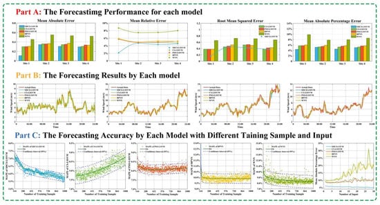 The analysis of the wind energy resources and power generation of a wind turbine at four wind-speed sites shows that the capacity factor of wind turbine generation is 35.860%, 26.825%, 27.456%, and 28.738%. To reduce the operational cost of a wind farm, it is very important to improve the short-term wind speed forecasting accuracy. This section focuses on establishing the accuracy of the short-term wind-speed forecasting model and analyzing the forecasting results.