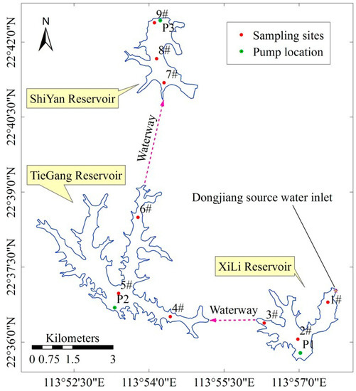 The cascading reservoirs monitored in this study are located in Southern China (east longitude 113°52′–113°57′, north latitude 22°36′–22°42′; Figure 1). The Xili Reservoir was built in 1960. Encompassing a collection area of 29 km2, the Xili is the uppermost cascade reservoir. The total storage capacity and normal storage capacity of the Xili Reservoir are 32.38 million m3 and 24.82 million m3, respectively. The Tiegang Reservoir was created in 1957 and has been expanded four times. The Tiegang encompasses a collection area of 64 km2, with total storage and normal storage capacities of 99.50 million m3 and 94.00 million m3, respectively. The Shiyan Reservoir, the last cascade reservoir, encompasses a collection area of 44 km2. The total storage capacity and normal storage capacity of the Shiyan are 32.00 million m3 and 16.90 million m3, respectively. According to the competent water authority’s historical data from 2010 to 2014, the Xili Reservoir received an average daily inflow of 1.06 million m3 from the Dongjiang River and delivered 1.04 million m3 per day to the Tiegang Reservoir via artesian flow. The Tiegang Reservoir transported 0.72 million m3 per day to the Shiyan Reservoir through the Tieshi pump station.