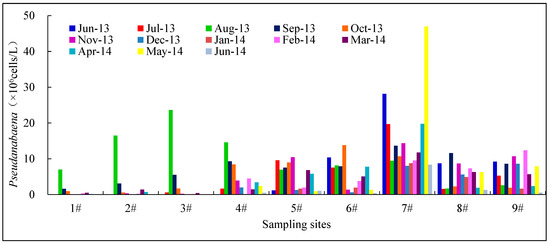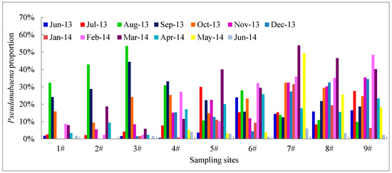 In this study, the dominance values of Pseudanabaena sp. of nine sampling sites were calculated, as shown in Table 3. It is defined that if the value of a species is greater than 0.02, this species is considered dominant throughout the calculating period. Hence, Pseudanabaena sp. dominated all of the reservoirs over the whole monitoring period. Moreover, the dominance value was lowest at site #1 and highest at site #7. The Pseudanabaena proportion in Figure 4 refers to the ratio of the number of Pseudanabaena sp. cells to the total number of phytoplankton cells. In the Xili Reservoir, Pseudanabaena sp. was detected in a high proportion from August 2013 to October 2013. The highest Pseudanabaena sp. Proportion, which was over 50%, appeared at sampling site #3 in August 2013. The monthly average Pseudanabaena sp. proportions of the three sites (#1, #2, and #3) in the Xili Reservoir were 7.57%, 9.15%, and 11.64%, respectively. In the Tiegang Reservoir, although the highest proportion was 40.11% at site #5 in March 2014, which was lower than the Xili Reservoir, the number of months during which the proportion was over 10% increased. Further, there were four months at site #4, five months at site #5, and six months at site #6 with Pseudanabaena sp. proportions over 20%. The monthly average Pseudanabaena sp. proportions of the three sites in the Tiegang Reservoir (#4, #5, and #6) were 14.91%, 15.69%, and 17.22%, respectively. In the Shiyan Reservoir, the proportion further rose to exceed 30% for most months. There were six months at site #7, four months at site #8, and four months at site #9 during which Pseudanabaena sp. proportions exceeded 30%. The highest Pseudanabaena sp. proportion reached 53.90% at site #7. The monthly average Pseudanabaena sp. proportions of the three sites in the Shiyan Reservoir (#7, #8, and #9) were 26.32%, 22.66%, and 23.53%, respectively. The spatial average Pseudanabaena sp. proportion had an obvious seasonal variation, as shown in Appendix C. It dominated mainly in March and August.