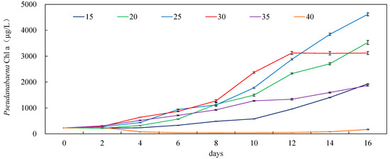 Water temperature was acknowledged to be the most important factor contributing to the cyanobacterial abundance. Pearson correlations between Pseudanabaena sp. cells/proportion and environment factors were performed, with the results shown in Table 4. Pseudanabaena sp. cells were significantly positively correlated with water temperature (p < 0.01). The effects of different water temperatures on Pseudanabaena sp. growth were further investigated through laboratory experiments. The Pseudanabaena sp. growth curve under different water temperatures evaluated by the Chl a concentration is shown in Figure 5. The specific growth rate µ of Pseudanabaena sp. on the 16th day was calculated as shown in Table 5. The optimum growth water temperature for Pseudanabaena sp. was 25 °C, with the maximum specific growth rate of 0.188 ± 0.001 d−1. It was also found that Pseudanabaena sp. has a strong adaptability to temperature. It could grow well with a specific growth rate over 0.13 ± 0.00 d−1 under temperatures ranging from 15 °C to 35 °C. However, a temperature within the range from 20 °C to 30 °C was better for the growth of Pseudanabaena sp., and this temperature range allowed the specific growth rate to be above 0.16 ± 0.00 d−1 on the 16th day. Water temperature was the factor that had the greatest influence on the Pseudanabaena sp. distribution. In Nansi Lake of China [19], Pseudanabaena is dominant from May to October when the mean water temperature exceeds 20.2 °C, which is consistent with the results of this study. Microcystis was limited at temperatures lower than 15 °C and enhanced gradually when the temperature increased up to 25 °C [10,35]. Thus, the preference for the temperature of Pseudanabaena sp. was similar to Microcystis. In the reservoirs of this study, the monthly mean water temperature of the reservoirs was 25.2 °C (15.3–30.9 °C) for the surface layer, 24.9 °C (15.1 °C–30.7 °C) for the middle layer, and 22.3 °C (14.3 °C–27.7 °C) for the bottom layer, suitable for the Pseudanabaena sp. growth. Accordingly, the adaptability of Pseudanabaena sp. to a wide range of water temperatures may partly account for its year-round dominance.