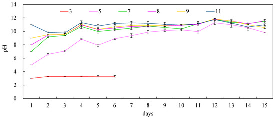 To explore the effect of pH on Pseudanabaena sp. growth, cultures were prepared in two treatment groups with initial pH gradients designed as follows: 3, 5, 7, 8, 9, and 11. For one group, the Chl a and pH were determined every day without pH adjustment. Meanwhile, for the other group, the Chl a and pH were determined every day and then the pH was adjusted to the initial value through the addition of hydrochloric acid or sodium hydroxide with a concentration of 0.1 mol/L.