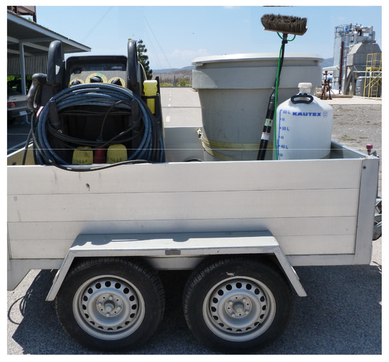 The vehicles used for washing can be dedicated exclusively to spraying pressurized water or may include also a contact cleaning tool. For example, three modes for cleaning (brushing with low-pressure water, cleaning using only high-pressure water, cleaning with cleaning brushes using high pressure water) were adopted in [
