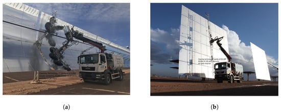 18]. Generally, the type of cleaning vehicles used in CSP plants are trucks equipped with a tank and pump unit in addition to the necessary cleaning tools, that is nozzles for water jetting at a range between 30 bar and 200 bar and brushes, squeegee, or sponge for contact cleaning.