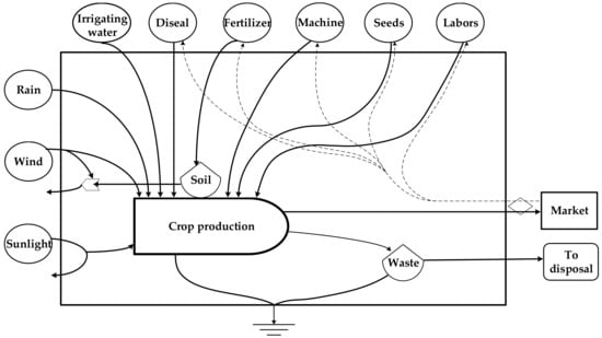 A crop production system relies on various input flows including environmental inputs (e.g., sunlight, water, wind, and topsoil) and purchased economic inputs (e.g., mechanical equipment, fertilizers, pesticides, fuel, and labor.). The various input flows of crop production systems are usually measured by different units, which makes the calculation and comparison among them difficult. However, the most commonly used methods of ecological footprint (EF), life cycle assessment (LCA), material flow analysis (MFA), embodied energy (EA), and modelling methods are difficult to calculate the labor and services inputs included in crop production, which focus on the individual aspect of resource use and system metabolism [12]. Traditional economic value assessment often ignores the contributions of ecosystems to the production process, which reflects the demand of the receiver-side instead of considering the natural investments from a donor-side. Among the various assessment methods, emergy analysis, as an ecological evaluation method created by Odum [13], can solve this problem. Emergy is the sum of all available energy inputs directly or indirectly required by a process to generate a product [14]. It assigns a value to nature’s environmental effort and investments to make and support the flows, materials, and service to contribute to the economic system.