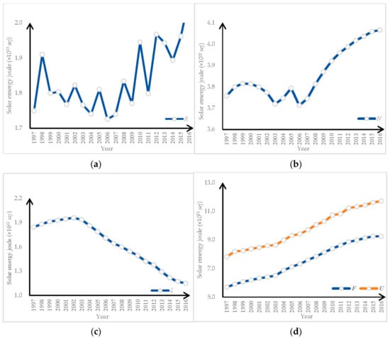 The emergy flows of China’s crop production system from 1997 to 2016: (a) the variation trend of renewable resources (R); (b) the variation trend of non-renewable resources (N); (c) the variation trend of labors (L); (d) the variation of purchased resources (F) and the total emergy used (U).