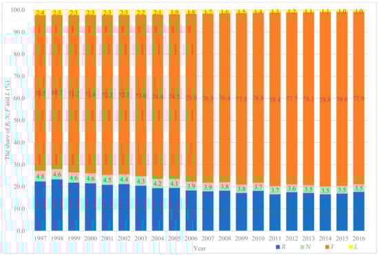 The share of renewable resources (R), non-renewable resources (N), purchased resources (F) and labor (L) of China’s crop production during the period of 2007–2016.
