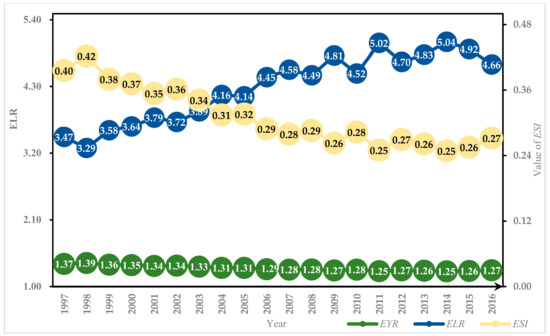 The variation trend of emergy yield ratio (EYR), environment loading ratio (ELR), and emergy sustainability index (ESI) of China’s crop production system from 1997 to 2016.