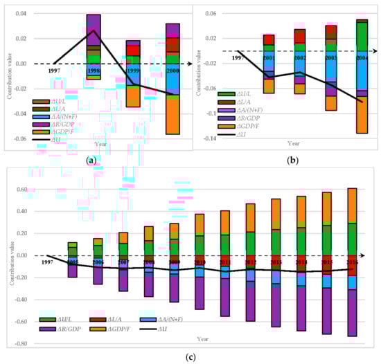 As seen from Figure 4, all the ESI values were less than the year of 1997, except for 1998, accompanied by a decreasing trend during this period. According to the variation trend of positive or negative contributors shown in Table 3, the driving forces of indicator ESI can be divided into three development stages. The first development stage was from 1998–2000 shown in Figure 6a, where the factors R/GDP, L/A, and U/L played a role in promoting ESI, while A/(N + F) and GDP/F acted as restricting factors for ESI growth. In 1998, the overall effect of the five indicators was positive as the renewable resources were large because of the huge precipitation and relatively slow GDP growth in crop production, leading to a larger positive contribution from factor R/GDP and smaller negative contribution from GDP/F. As shown in Figure 6b, the second stage from 2001 to 2004 was a little different from the first stage, where factor R/GDP changed from positive to negative, indicating that the growth of GDP for crop production was built on the overload of the environmental capacity, thus aggravating the extent of an unsustainable pattern. The last stage experienced a long time, from 2005 to 2016, as shown in Figure 6c. There were two distinguished changes during this period where positive contributor L/A became negative and the simultaneously negative contributor GDP/F acted as a positive one, completely opposite to the first two stages. This phenomenon indicates that the improvement of resource efficiency played a vital role in promoting the sustainable production pattern, while decreasing the number of laborers who were already engaged in crop production impeded the sustainable development of China’s crop production with an increasing negative contribution percentage of L/A year by year, which verified the research findings from Xu [43] and Yu [44] that urbanization and technological advancement were two key factors affecting the sustainability of agriculture. In summary, there were more positive contributors in the first stage than in the second and third stages. As per an increasing number of negative contributors, the indicator ESI showed a gradually decreasing trend after the first period, indicating a decline in the sustainable level of China’s crop production.