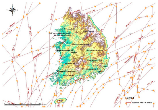 The frequency of extreme meteorological events has increased exponentially in Korea, with resulting increases in damage [1]. In August 2002, Typhoon Rusa hit the southern coast of the Korean Peninsula with highly destructive force. The estimated losses were approximately 4600 million USD in this single event. Typhoon Maemi (2003) and Typhoon Olga (1999) struck the southern coast and the western part of the Korean Peninsula, incurring losses of approximately 3800 million USD and 900 million USD, respectively [2]. Tropical cyclones occur frequently during a short season, inducing losses and creating problems such as demand surges. Hurricanes occur year round, but 40% occur in September. On average, 6.1 hurricanes and 1.73 typhoons hit the United States annually [3]. To manage the tremendous and critical damage from tropical cyclones in the United States, the Federal Emergency Management Agency (FEMA) conducted a HAZUS-Multi Hazard (HAZUS-MH) analysis to predict loss due to floods, earthquakes, and hurricanes. In addition, Florida, a region frequently damaged by tropical cyclones, has developed the Florida Public Hurricane Loss Model (FPHLM) as an effective tool to estimate insurance premium rates according to the disaster risk.