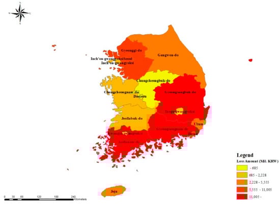 This study used the typhoon loss records from annual reports of the Ministry of Public Safety and Security (MPSS) for ten years from 2003 to 2015 to define the dependent variable. The damage records are adjusted using the inflation rates to compare equivalent damages. The MPSS has published reports annually since 1979 to record the damages, including victims, causalities, and losses from natural disasters, such as floods, typhoons, heavy snow, and storm surges. The loss used in this study includes building damages caused by typhoons, covering all sectors of the public and private sectors. As shown in Figure 1, 15 typhoons have hit the Korean peninsula and caused critical damage. The western and southern coastal regions are the most frequently struck by typhoons. Figure 2 depicts the spatial distribution of typhoon damages. Table 1 shows the summary of typhoon damages by regions. The damage has occurred throughout all provinces. In particular, the southern part of South Korea has incurred deadly losses in terms of the dollar amount of damage in areas such as Gyongsangnam-do, Jeollanam-do, Gyongsangbuk-do, and Busan. The area most prone to typhoons is Gyongsangnam-do.