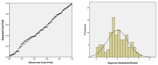 The Kolmogorov–Smirnov test and the Shapiro–Wilk test were adopted to examine the normality of the residuals. These tests are based on verifying the observations against the predicted values converted to z-scores and the actual normal distribution. For instance, if the p-value of the test is not significant, the distribution of the observations means that the actual normal distribution is not different. On the other hand, if the p-value of the test is significant, it represents that the distribution of the observations is different from the actual normal distribution. As shown in Table 6, the p-value of 0.200 and 0.027 prove that the distribution is normal, since the p-value was higher than 0.05. The Q-Q plots and the standardized residuals histogram in Figure 3 also show that the model’s residuals were normally distributed. As shown in Figure 4, the residual plots for homoscedasticity were examined. The residuals are arbitrarily spread with unsystematic patterns. This indicates that the variance of the residuals is constant.