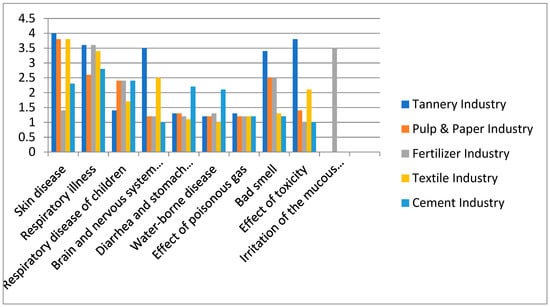 Figure 2 shows a comparative analysis of health hazards among tanning, pulp & paper, fertilizer, textile, and cement industries. Human skin is severely affected by the harm of tannery, pulp, and textile operations. Why is human health seriously affected by these firms’ operations? According to researchers [114,115,116,117], the discharge of chromium from the tanning operations is what is responsible for the health hazards. Figure 2 shows that respiratory illness also rates very highly as a health hazard in the case of tanning, fertilizer, and textile operations, while the effects to the brain and nervous system is also very high the case of tanning operations. On the other hand, diarrhea and stomach-related diseases, and waterborne disease, due to the effects of poisonous gases, are relatively less affected. There are significant health hazards caused by tanning operations in other areas of Bangladesh as well; for example, approximately 12,000 laborers in the tannery industries of Hazaribagh (Dhaka) have been suffering from more than one disease [65]. These laborers in Hazaribagh (Dhaka) also depend on the Buriganga River for their water in their day-to-day life as they are members of a low income group. It has been revealed [85,118,119] that the untreated wastes of Hazaribagh (Dhaka) tannery industries are discharged into the Buriganga River which is putting the river’s ecosystem into peril [85,118,119]. The World Health Organization (WHO) estimates that 80 percent of all diseases in the world are water-related [80]. Figure 2 also shows that irritation to the mucous membranes of the nose, throat, and eyes ranks highly as a health hazard due to fertilizer operations. What are the harmful pollutants of fertilizer industries that are most responsible for human health hazards? A study [83] reveals that breathing urea dust and gaseous ammonia that is generated from fertilizer operations is responsible for various health problems in workers in Bangladesh. It is clearly evident from this discussion that polluting industries discharge untreated harmful effluents that are mostly responsible for health hazards resulting in a huge social cost to Bangladesh.