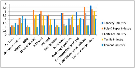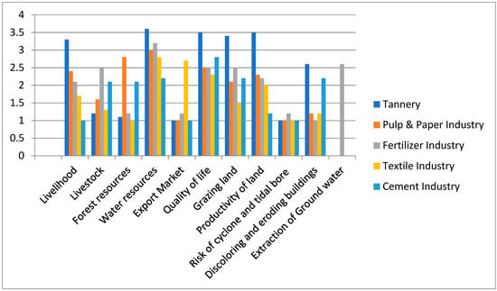 Figure 3 presents a comparison of the levels of environmental hazards due to polluting industries from Tannery, Pulp & Paper, Fertilizer, Textile, and Cement sectors.