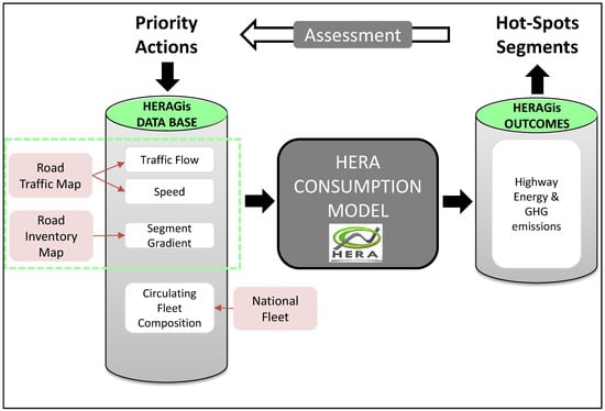 The HERA methodology is used to assess the energy and carbon footprint of highways’ traffic flow [13]. The main features of HERA methodology are shown in Figure 1. HERA is based on a bottom-up methodology which combines an average speed consumption model adjusted with a segment gradient and information on the spatial distribution, by road segment, of vehicle activity with data on vehicle type (average annual daily traffic—AADT-), driving speeds (mean speed of light and heavy vehicles), physical characteristics of the road (length, gradient, number of lanes), and the composition of the fleet circulating along these roadway types. Since HERA is designed for interurban traffic, the transient process of traffic emission such as acceleration or deceleration is not captured, being more important for urban areas assessment [14,15]. HERA produces several outputs: annual GHG emissions and energy consumption (CO2eq/year and MJ/year, respectively), and emissions and energy intensity (CO2eq/veh-km and MJ/veh-km, respectively). Emissions intensity is the emission rate of CO2eq produced by an average vehicle and per km of a given road section. Emission intensity is strongly correlated with traffic flow characteristics, operation strategies and driving behaviour. The main capability of HERA is that it enables strategies to be devised for carbon efficient management of the highway operation and gradient design. These strategies could be applied to a segment of a highway or to an entire network. Policies can be planned to achieve efficient targets by acting on the main input variables (such as speed, road gradient or vehicle type) [16]. One of HERA’s capabilities is that input data—traffic maps and road inventory which are usually geo-referenced—could be merged in the HERAGis input database in order to obtain geo-referenced results.