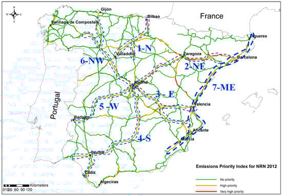 - Identification of hot spot corridors. To tackle climate change problems, it is especially important to establish a priority-ordered plan [27]. Strategies can therefore be applied to the most polluting areas in order to obtain the highest savings. The paper proposed an index (EPI in Section 3) which sorts by priority all road segments or corridors with emissions problems. The EPI was obtained for the Spanish NRN and is shown in Figure 3. Seven corridors were recognised as hot spots. These top seven corridors comprise 25% of the network and are responsible for 51% of the total GHG emissions of the NRN. The outcomes show that these inefficient corridors have a high rate of heavy vehicles, high speeds and steep gradients.